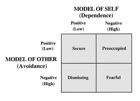 The above model (taken from Bartholomew, 1990) is one representation of attachment styles, or ways of dealing with attachment, separation, and loss in close personal relationships. Attachment was first studied in non-human animals, then in human infants, and later in human adults. Attachment Styles: An Evolving Taxonomy of Evolutionarily Adaptive and Maladaptive Affectional Bonds