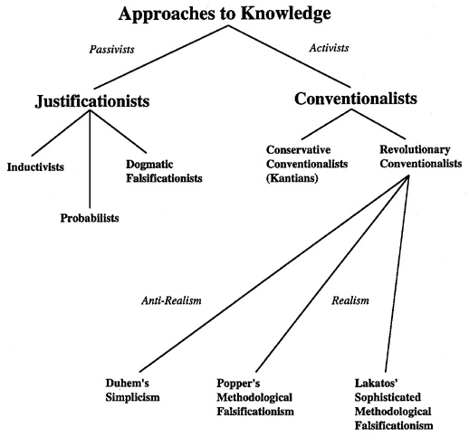 Metatheory, which deals with methods of evaluating theories, has traditionally been the province of philosophers of science, although psychologists implicitly use metatheories whenever they evaluate theories. The original figure below is a taxonomy of metatheories. Click on any approach to knowledge below the figure to learn more about it.