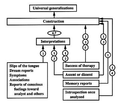 The figure below (Von Eckardt, 1986) represents epistemological problems in Freud's use of clinical data as discussed by Grünbaum (1984) (circled numbers correspond to numbered problems at left; arrows represent the relation "is considered evidence for"). Grünbaum's Arguments